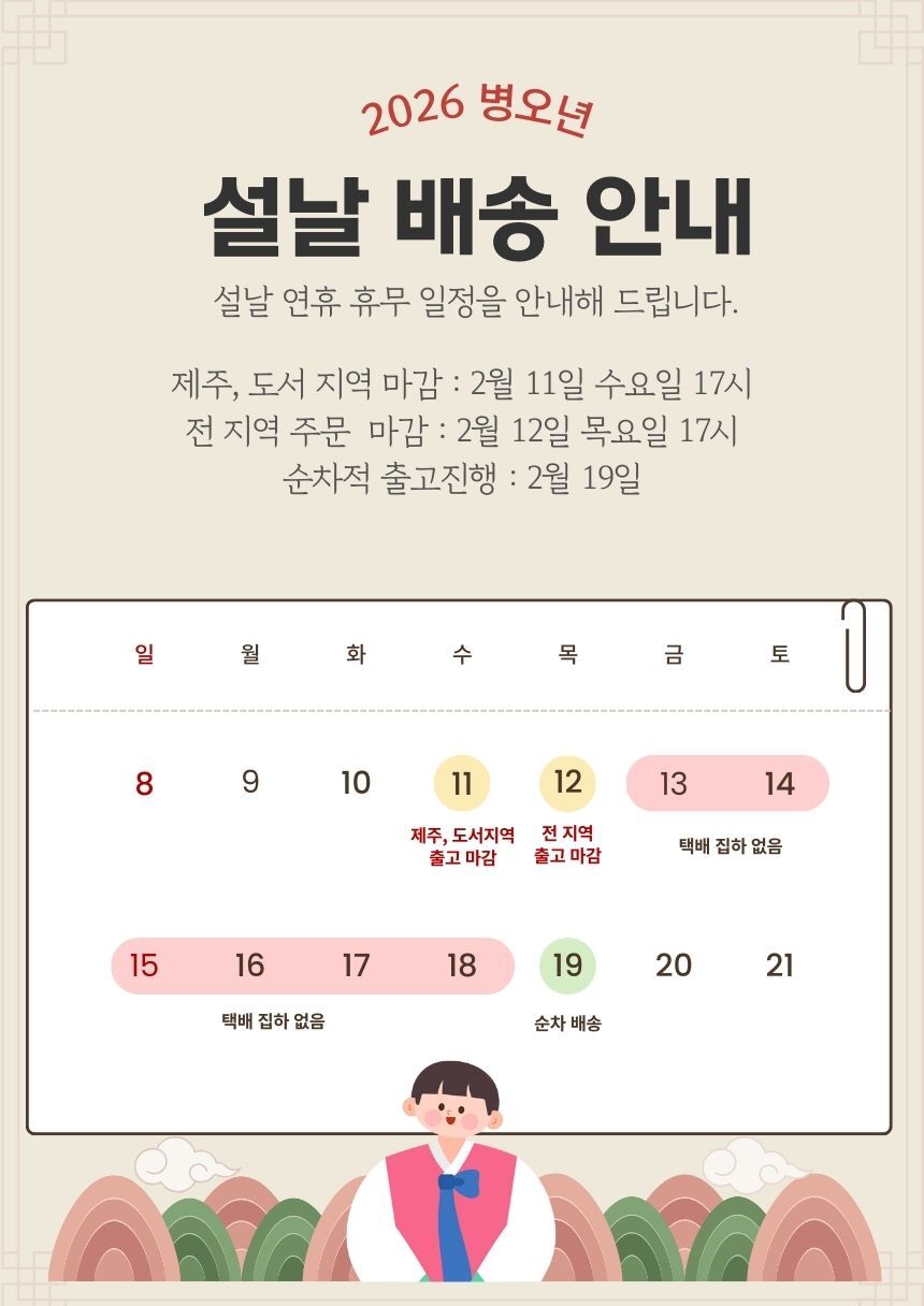 • 배송 안내 : - 제주도나 도서 산간 지역은 추가 항공 운임료가 발생되고, 부피가 큰 상품은 추가 배송료가 발생할 수 있습니다